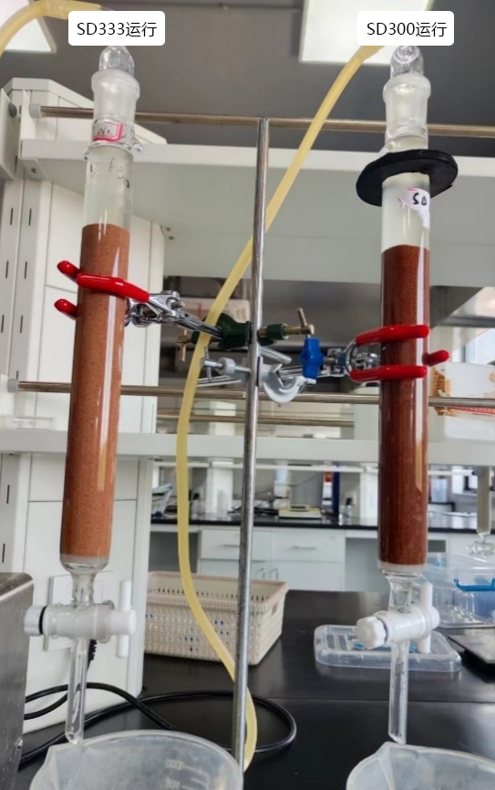 通过静态试验可以看出,SD300和SD333大孔吸附树脂用于此废水降COD效果较好,因而采用SD300和SD333两种树脂分别进行动态运行试验,