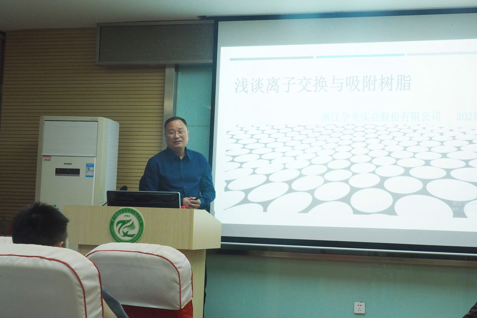 揭牌仪式之前,华中科技大学化学与化工学院举办了离子交换与吸附树脂学术研讨会,华中科技大学化学与化工学院副院长、先进高分子功能材料联合研发中心主任谭必恩教授特邀争光股份董事长沈建华先生做了题为”浅谈离子交换与吸附树脂“的演讲,沈总在演讲中生动地描绘了离子交换与吸附树脂这颗神奇小球的美丽,阐述了其广阔的应用领域和市场前景,并和在场师生共同畅谈中国离子交换树脂发展的前沿技术,一起探讨离子交换与吸附树脂研究的未来趋势,勉励华科大的天之骄子们为国家科学技术发展做出更大贡献。