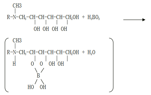 硼酸是极弱的酸,容易与山梨醇等多价醇反应形成络合物,硼酸与多价醇形成稳定的环状阴离子,络合物呈强酸性。山梨醇的衍生物N-甲基葡聚糖胺是多价醇与硼之间生产络合阴离子,其氨基部分作为阴离子交换基扑捉生成络合阴离子,从而选择性吸附硼酸。